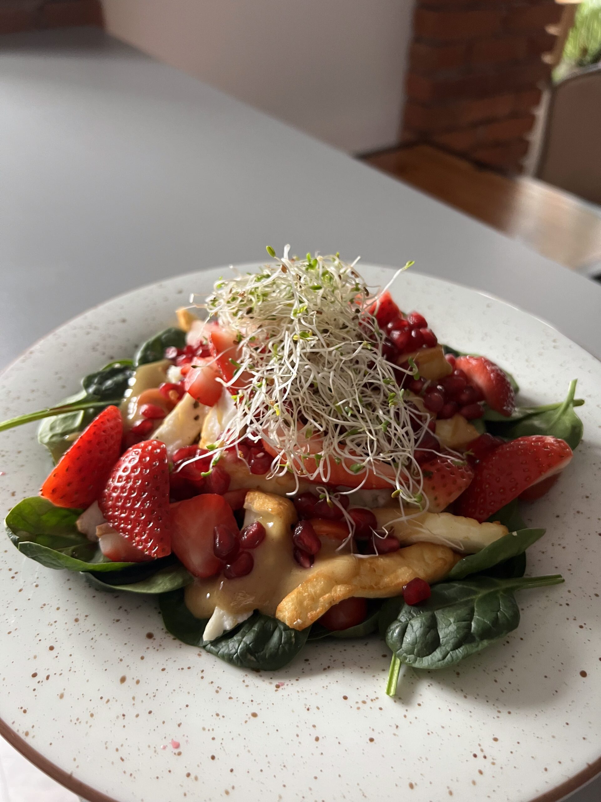 Skład: szpinak, halloumi, granat, truskawka, płatki migdałów, sos