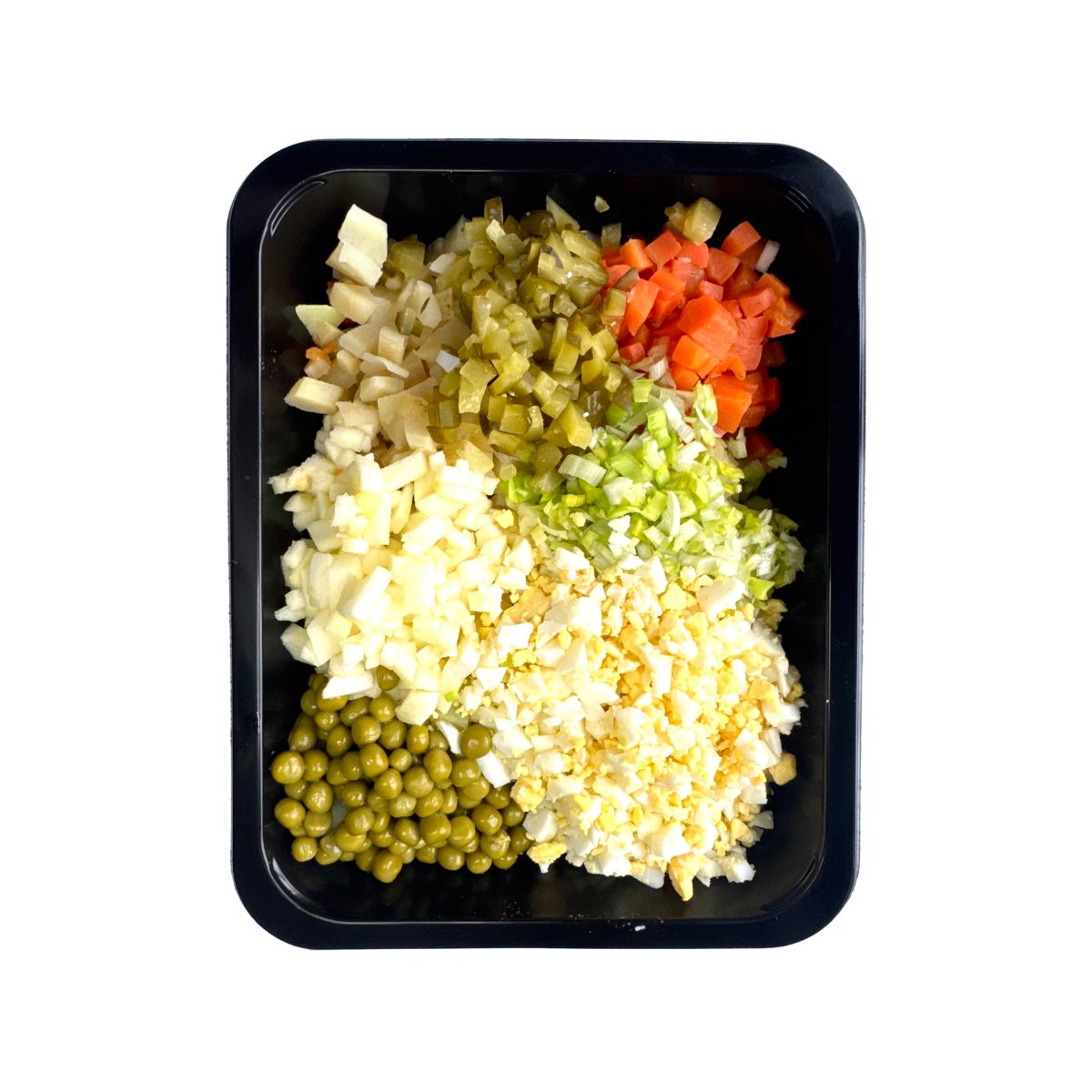 Skład: seler, ziemniak, marchew, pietruszka, jabłko, por, groszek, jajo, ogórek kiszony, majonez, musztarda sarepska, przyprawy.